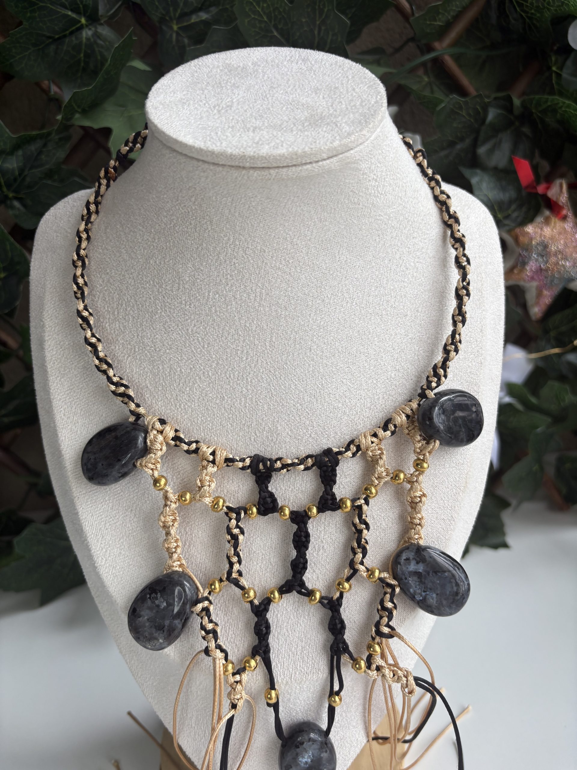 Entièrement fait main, il associe des fils noir et beige tissés en macramé, des perles dorées raffinées et de splendides pierres naturelles Larvikite A+ reconnues pour leurs reflets argentés et leurs vertus protectrices ✨
